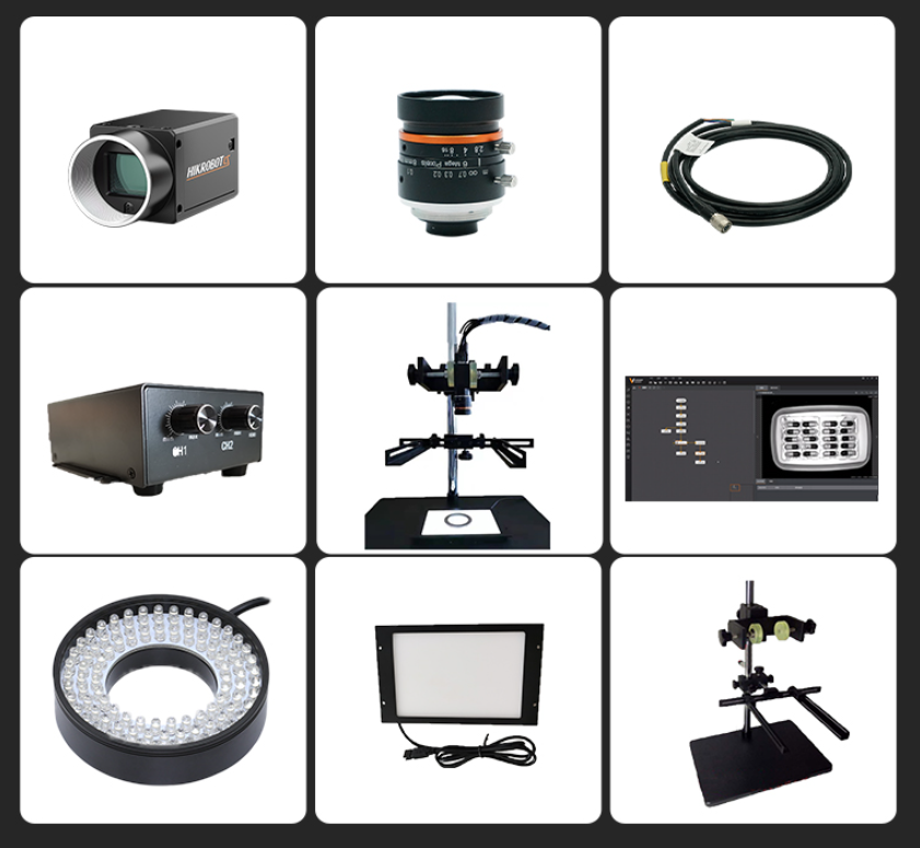 1、海康机器人600万彩色卷帘工业相机;2、海康机器人600万8mm焦距工业镜头;3、海康机器人600万相机3米配套线缆;4、120mm90°环形光源;5、130mm*90mm底部发光倍光源;6、基础款机器视觉平台安装架。